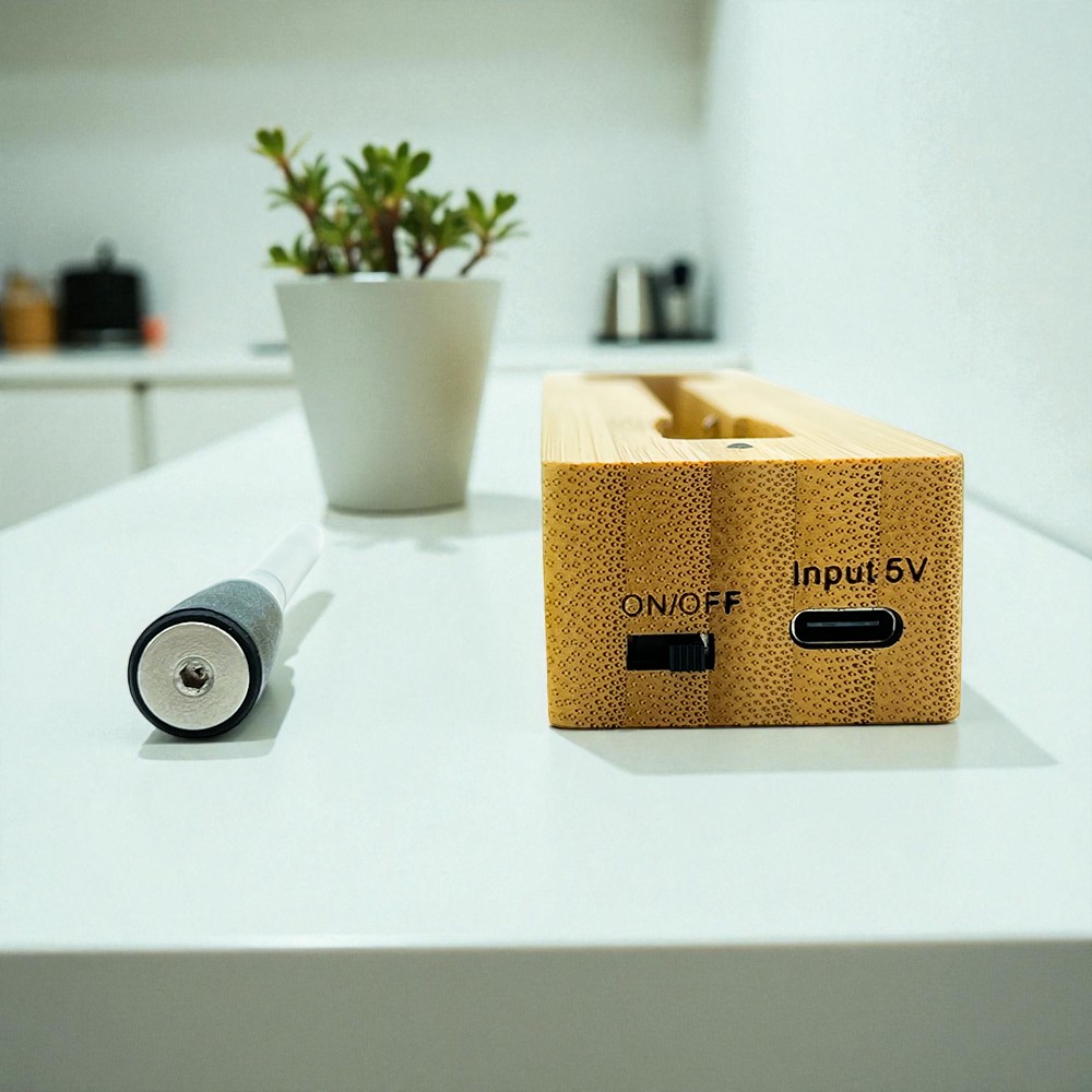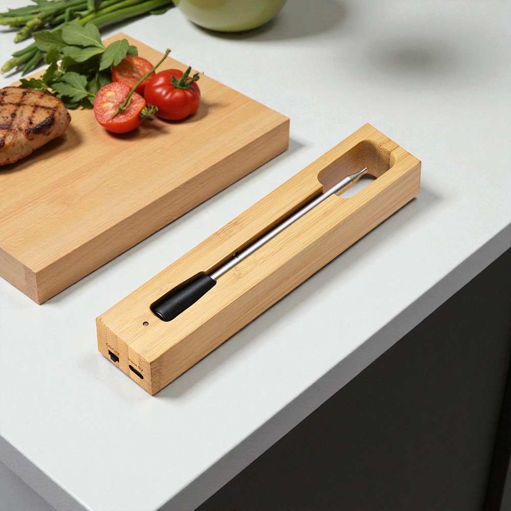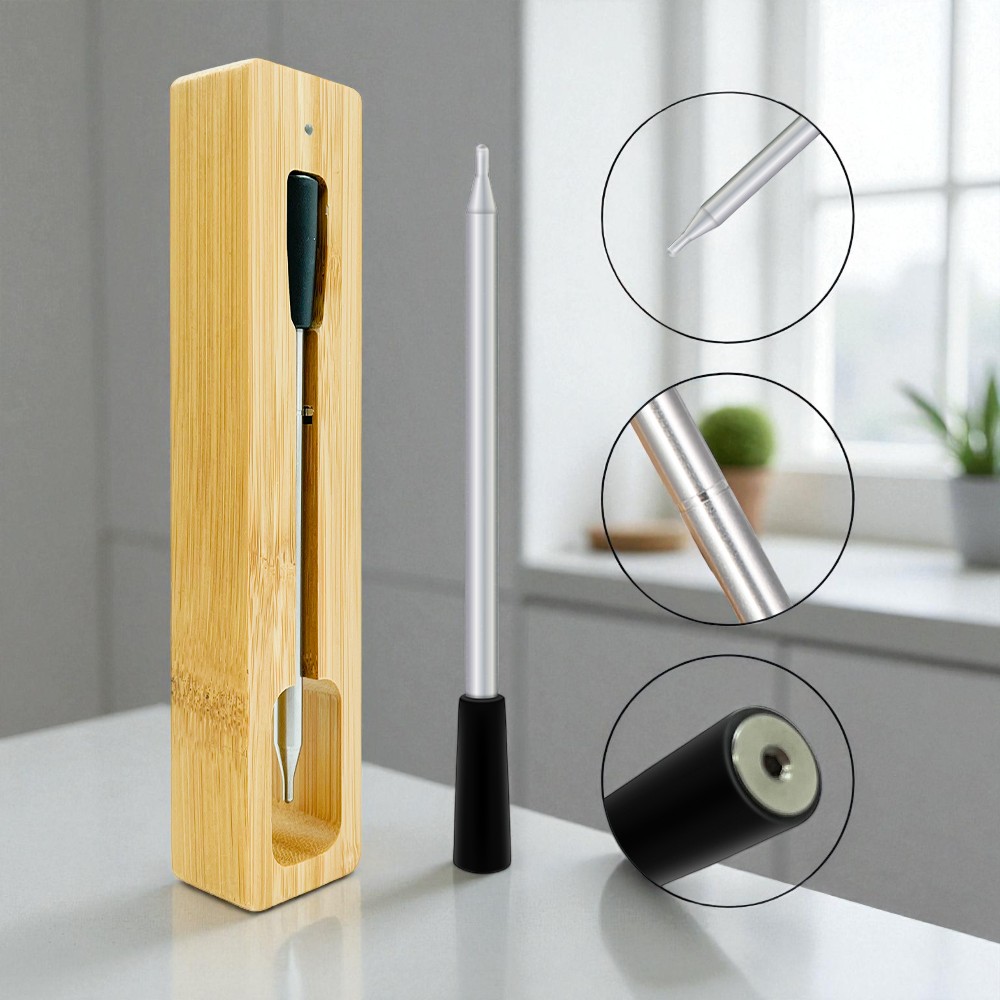 De thermometer werkt volledig draadloos en is uitgerust met een RVS 304-probe en een hittebestendige kunststof kop. Met één snelle USB-lading van slechts 20 minuten grill je tot wel 6 uur lang. Het bamboe-oplaadstation ziet er niet alleen stijlvol uit, maar is ook milieuvriendelijk en waterbestendig (IP67).
